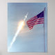 A bandeira americana anuncia o voo da Apollo 11, a primeira missão de pouso lunar do homem. O veículo espacial Apollo 11 Saturn V levantou-se com os astronautas Neil A. Armstrong, Michael Collins e Edwin E. Aldrin Jr. às 9:32 da manhã EDT do Complexo de Lançamento 39A do KSC. Durante a missão planejada de oito dias, Armstrong e Aldrin descerão num Módulo Lunar (LM) à superfície da Lua enquanto Collins orbita no Módulo de Comando. Os dois astronautas devem passar 22 horas na Lua, incluindo duas horas e meia fora do LM. Eles coletarão amostras de material lunar e implantarão experimentos científicos que transmitirão dados sobre o ambiente lunar. Eles se juntarão novamente a Collins no Módulo de Comando para a viagem de volta à Terra.
