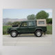 Verde Land Rover Defender 110 com campo e montanhas em segundo plano.
