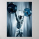 Uma poderosa pintura a óleo de Art Deco de uma vista baixa, de três quartos atrás, representando uma heroica halterofilista que segurava uma campainha em cima, sua forma muscular definida por uma luz forte, fria e uma paleta industrial de blues de safira e cinzentos de pistola.