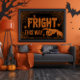 Uma mão mórbida aponta a direção desse macabro, aranha e teia enchendo o poster do Fright This Way, com brilho laranja sobre fundo preto dramático a jato.