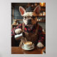 Seu canto do café ficou mais fresco. Esta hilariante peça de arte mostra um Bulldog Francês em uma camisa vermelha e preta de flanela, suspenders de balanço e especificações enquanto ele artesanato o perfeito latte. Com o "Latido Roast" no quadro e o frio na pata, ele claramente tem muito café — e ama-o. Seu rosto esquisito e avental manchado de café completam a vibração. Uma obrigação para baristas, amantes franceses e criativos alimentados com cafeína.