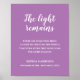 Esta elegante placa de lavanda e memorial branco, com a frase tocante "Os restos de luz" é uma bela maneira de lembrar e honrar o amado na Celebração da Vida. Personalize com seu texto na parte inferior.
