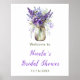 Belo sinal de boas-vindas ao chá de panela com flores lavandas num frasco de mason. Perfeito para um chá de panela. As palavras podem ser alteradas para se adequarem aos seus próprios detalhes ou requisitos