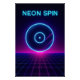 Un cercle lumineux (cyan ou rose néon) flotte au centre, simulant un disque vinyle en rotation ; en dessous, une grille vectorielle à l’horizon crée de la profondeur. Des reflets linéaires suggèrent mouvement. Le titre "Neon Spin" s’affiche en typographie monospace rétro, avec un léger halo, en haut ou en bas. Une affiche qui respire l’énergie synthwave, festive et nostalgique.