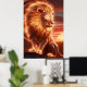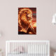 Uma cena cósmica mesmerizante com um leão celeste, feita de luz giratória e energética. Os olhos do leão ardem brilhantemente com um brilho radiante, enquanto seu magnífico ouro humano e pelo brilham com um intenso e feroz brilho. Empolgada num terreno rochoso, a criatura majestosa é um farol de energia primária. O sol se põe no fundo, banhando a paisagem em tons quentes e ricos de laranja e rosa, evocando uma sensação de maravilha e admiração.