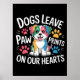 Este gráfico animado retrata um cão de desenho animado marrom e branco espirituoso, com a língua estendida alegremente, em uma postura de corrida divertida. Acima e abaixo do cachorrinho alegre, a mensagem "CÃES DEIXAM MARCAS DE PATAS NOS NOSSOS CORAÇÕES" é poderosamente transmitida em texto branco e vermelho em negrito, adornado com um coração vermelho vibrante e marcas de patas coloridas espalhadas em amarelo, azul e rosa. O fundo preto sólido fornece um forte contraste. Download digital apenas para uso pessoal.