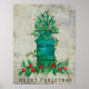 Um poster de "Feliz Natal" decorado com um design de colagem de fazenda com galhos de pinheiro decorados, uma lata de leite de vintage com ornamentos vermelhos ao longo da base em um fundo de papel de guião.