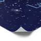 Impressão com o símbolo de Leo em azul-prata suave, sobreposto às estrelas da constelação, contra um fundo do céu estrelado formando de azul-da-meia-noite a preto.