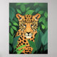 Impressão num leopardo com olhos brilhantes e intensos a vaguear através de uma luxuosa folhagem verde. O nítido contraste entre o pelo pintado do leopardo e as folhas vibrantes cria um efeito visual impressionante.