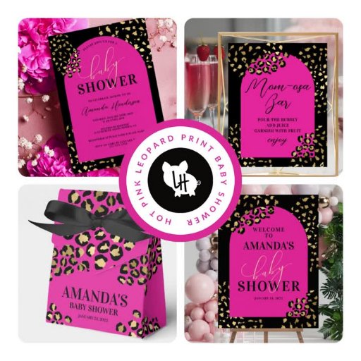 Celebrar com um bar da Mãe-osa e mostrar este sinal de bar da mãe-osa, cor-de-rosa e impresso-leopardo. Com uma bela paleta cor-de-rosa, dourada e preta, esta placa é perfeita para um chá de menina. A design divertida e elegante captará a atenção de seus convidados e dará o tom para uma celebração festiva.