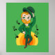 Poster com uma Ilustração de um duende sorridente e alegre dançando vestindo um terno verde, uma gravata de arco e um chapéu de boliche; com notas pretas e um arco-íris amarelo e laranja em fundo verde. Uma design perfeita para celebrar o Dia de São Patrício!