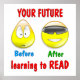 Promover a leitura e quão importante ela é para uma vida melhor com esta design divertida com um rosto antes e depois mostrando a vantagem de aprender a ler. Excelente para professor ou bibliotecário.