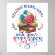 Design vibrante e colorido com um dragão com pilha de livros, o de cima aberto com rosas azuis e cor-de-rosa. O texto colorido diz: "Ler sonha com seus olhos abertos". Esse design está disponível em uma grande variedade de produtos.