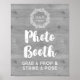 Letreiro de cabine de fotos de casamento em poster com padrão de madeira cinza rústico com ilustração de coroa vintage e texto personalizado em estilo de letra à mão e monograma.