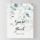 Este letreiro de livro de visitas com caligrafia a ouro e eucalipto rústico é perfeito para um casamento simples ou chá de noiva. Este design artístico apresenta flores douradas desenhadas à mão e folhagem verde de eucalipto em aquarela, inspirando beleza natural.