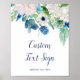Este letreiro de texto personalizado clássico para chá de bebê com flores brancas é perfeito para um evento de primavera. O elegante design floral apresenta rosas, peônias e crisântemos suaves em marfim e branco, com toques de flores de aguarela azul e folhagem verde. Personalize o texto para dizer o que você quiser! Este letreiro pode ser usado para cartões e presentes, livro de visitas, hashtag de casamento, brindes, barra de sobremesas - qualquer coisa! Pode ser usado para um casamento, chá de noiva, jantar de ensaio ou qualquer evento. A linha de texto na parte inferior do letreiro pode ser personalizada com a data ou uma mensagem curta como "Obrigado". Se você quiser vários letreiros coordenados, personalize e adicione ao carrinho um de cada vez.