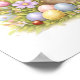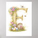 Adorable Letter F monogram poster featuring ornate gold filigree with a sweet hedgehog holding a pink flower beside colorful Easter eggs and spring tulips. Pink daisies, a graceful dragonfly, and a buzzing bee complete this woodland scene. Gallery-quality Giclee print on durable 185gsm microporous resin-coated paper with semi-gloss finish and pigment-based inks for vibrant, fade-resistant color.