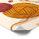 Lhama de desenho animado vestindo uma echarpe de tricô e segurando agulhas de tricô cercada por bolas de fio.