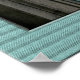 Esta é uma fotografia da Estátua da Liberdade, com um céu azul atrás dela, e uma borda verde texturizada que corresponde à cor da sua pele de cobre.