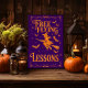 Uma poster de festas roxa do Halloween que oferece lições de voo gratuitas de uma bruxa laranja-reluzente em uma vassoura, cercada por morcegos laranja-reluzentes e estrelas.