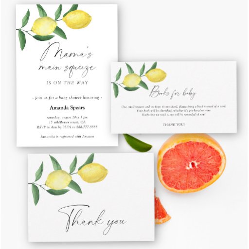 Cartão de chá de fraldas neutro com cor d'água em forma de limão, com aspecto neutro do gênero, com ilustração de um limoeiro com as frutas dos citrinos. Use as ferramentas de design para editar o texto, alterar a cor e o estilo da fonte para criar um design de convite exclusivo. Itens correspondentes disponíveis.