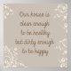 Este bonito design de arte de texto apresenta um fundo bronzeado, espirais florais coloridos de amêndoa e texto que diz: "Nossa casa é limpa o suficiente para ser saudável, mas suja o suficiente para ser feliz".