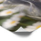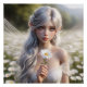 Uma bela fada de cabelo prateado com asas transparentes vestindo um vestido branco bonito e joias de diamante segura uma margarida branca solteiro enquanto fica em um campo de margaridas.