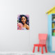 Este trabalho de arte de retrato floral apresenta uma linda e sorridente mulher negra adornada e segurando híbridos. Uma pintura brilhante, colorida e alegre, com cor rosa, azul, laranja, travessa e vermelha.