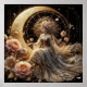 Linda Mulher Steampunk na Lua em um Fundo Negro cercado por flores com discagem celestial no fundo.