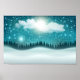 Paisagem de neve da floresta noturna. Lá fora. Belo poster de férias de inverno com árvores e o céu noturno nublado e estrelas. Cor azul.