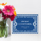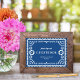 Este elegante, porém moderno, letreiro para recepção de casamento inspirado em papel picado apresenta uma bela moldura ornamentada em branco, um fundo azul colorido e tipografia festiva. Personalize este modelo como um letreiro de mesa para brindes, livro de visitas, cardápio, buffet, etc. O tamanho padrão é de 5" x 7", que se ajusta bem a uma moldura de foto de tamanho padrão que pode ser colocada sobre uma mesa.
