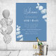 Um programa de casamento moderno, elegante, cronograma. Fundo azul empoeirado, decorado com eucalipto, prigs. Personalize e adicione seus nomes e detalhes do casamento. Se você tiver mais texto, é possível reduzir o espaço na linha.