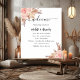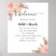 Um programa de casamento moderno e elegante, linha do tempo. Um fundo branco decorado com grama pampas e florais cor-de-rosa pincelados, rosas. Personalize e adicione seus nomes e detalhes do casamento. Letras pretas coloridas. Se você tiver mais texto, é possível reduzir o espaço na linha.