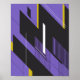 Este design é exibido como um trabalho de arte geométrico abstrato com linhas e formas de interseção, usando cores pretas, amarelas e roxas. A composição inclui espaços retangulares e linhas finas dispostas em ângulos diferentes, criando um sentido de movimento e de velocidade. O uso do branco adiciona contraste e desenhar atenção a áreas específicas dentro do design, enquanto o tom roxo dá uma vibração moderna e dinâmica.