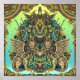Uma ilustração visualmente impressionante e intrincada que representa uma figura poderosa e blindada cercada por leões alados e ornamentados, elementos decorativos. O capacete da figura é adornado com chifres e penas, e seus olhos brilham com uma luz intensa.