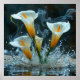 Lírios de calla deliciados com pétalas brancas e espadelas de laranja vibrantes, surgindo de uma superfície de água serena. À medida que a água sobe ao seu redor, as gotículas se agarram às flores, acrescentando um aspecto fresco e vibrante. Sabores de vapor ou névoa giram em volta das flores, melhorando a qualidade etérea da cena. O fundo tem um tom macio e mudo, que ajuda a destacar a beleza e a clareza das flores e o movimento dinâmico da água. No geral, a composição evoca um sentido de tranquilidade e elegância.