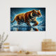 Laranja e listras negras piscam contra o azul vibrante enquanto um tigre majestoso de Bengala corre através do surf raso, criando um splash de espuma branca. Os poderosos músculos e movimentos graciosos do tigre são capturados nesta cena dinâmica. A luz solar brilhante melhora as cores vibrantes e o sentido de energia. O fundo desfocado do oceano destaca a presença marcante do tigre.