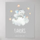 Este pequeno sinal de chá de fraldas de cinza de elefante é perfeito para um chá de fraldas simples. O design moderno apresenta um animal de safari, moderno e agudo, que dorme numa nuvem macia com estrelas amarelas cintilantes.