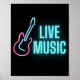 Esta poster é perfeita para muitos lugares, desde garagens até pequenos locais de música ao vivo, como cafés e tavernas ou boates. Texto do neon "Live Music" com contorno de guitarra rosa e aqua.