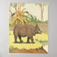 Rinocerontes caminhando até a borda de um buraco de água na selva com palmeiras, de um livro infantil desenhado pelo artista francês Benjamin Rabier. "Disponível em mais produtos" com o link.