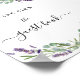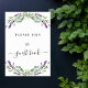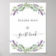 Um fundo branco decorado com flores lavandas e verde de eucalipto. Texto: Assine o livro de hóspedes.