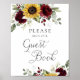 Sinal de Livro de Presentes de Casamento Floral de Girassóis com Verdura em Borgonha. Sinalização de Casamento Rústico.