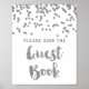 Por favor, assine nosso livro de visitas sinal de casamento pôster em branco e padrão de confetes prateados com letras estilo manuscrito. Perfeito para casamentos, chá de bebê, chá de noiva, aniversários, datas comemorativas e mais.