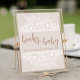 Sinal de bege com flores brancas e fonte marrom-cobre. Esta placa de chá de fraldas é uma forma excelente de mostrar aos hóspedes onde colocar os livros que trouxeram para o bebê. Este símbolo flexível e feminino é tudo o que você precisa para carregar o tema "baby-in-bloom" durante o seu evento.