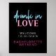 Este sinal de boas-vindas de despedida de solteira apresenta texto azul neon e rosa com a frase 'embriagada de amor'. Personalize facilmente para a sua festa de despedida de solteira, celebração de chá de noiva ou outro evento relacionado a estar louco de amor. 💜 AS CORES SÃO EDITÁVEIS! Clique em 'editar usando a ferramenta de design' na seção de personalização para selecionar suas próprias cores.
