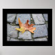 Uma folha de secagem de solteiro, da árvore de avião de Londres contra uma rua de pedra dura cortada à mão. Fotografia de Minerva Bloom.