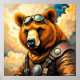 Uma criatura fantástica, parecida com um urso marrom, é adornada com acessórios steampunk, incluindo óculos e intrincada armadura. O vivo fundo dinâmico cria uma atmosfera perversa e aventureira.