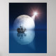 Uma ilustração de uma lua noturna de cheio sobre o mar com uma estrela cadente brilhante.