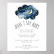Essas Luas e Estrelas não dizem que os sinais de jogos de bebês são perfeitos para um simples chá de fraldas. A design branca moderna apresenta uma forma de nuvem de marinho azul-d-água, enfeitada com uma lua crescente amarela e estrelas dispersas.
