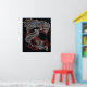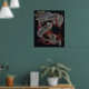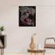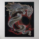 Dragão branco envolto em lua crescente vermelha sobre fundo preto